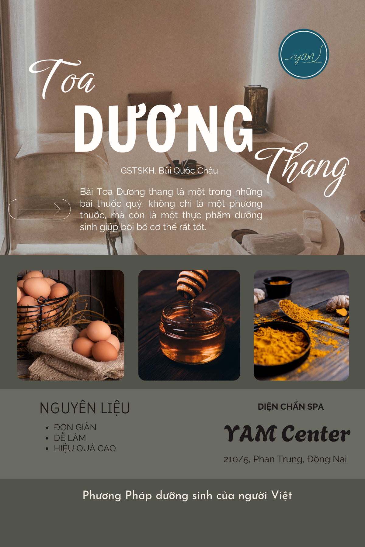 Toa Dương Thang sử dụng ba nguyên liệu chính mang tính dương mạnh: nghệ tươi, lòng đỏ trứng gà, và mật ong.